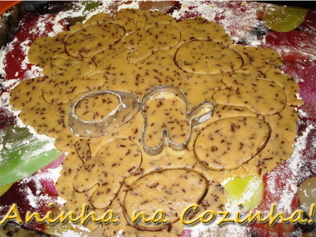 Com o auxílio de um rolo (ou um copo plástico resistente, no meu caso...rs...) abra a massa em superfície enfarinhada, corte os biscoitos usando cortadores.